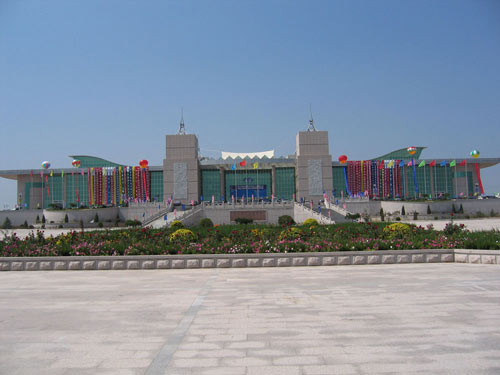 会展中心总占地面积10万平方米,由两部分组成, 会展馆建筑面积20000平方米,分上下两层,设有国际标准展位1000个,内部设施齐全,有可容纳500人的多功能厅、8.8米×2.6米超清晰电子显示屏。商务中心、会议中心、网络中心及餐饮服务中心一应俱全, 拥有现代化的自动扶梯,货运电梯、消防、监控、安全系统和一流的通讯网络保障。与会展馆配套的会展中心广场占地6.6万平方米,由三层平台组成,整体落差18米,广场全部由天然花岗岩铺建成,独具特色的设计风格,与会展中心浑然一体。巧夺天工的天然石雕及占地面积40%以上的绿色植物,令会展中心气势恢宏,巍巍壮观。