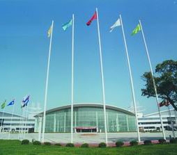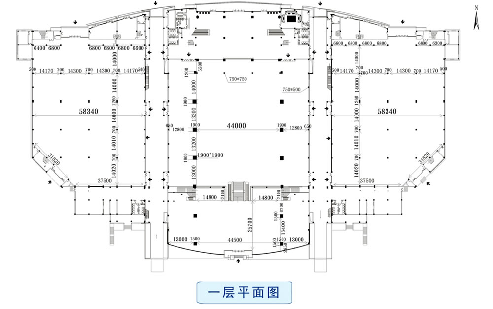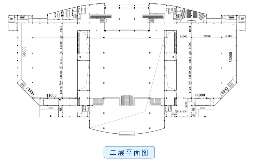 会展中心分主展厅和东、西五个展厅,北侧附楼为服务、会议、办公用房,分区明确又联系便捷,充分考虑使用上的分合,可保证不同展览同时使用,并互不干扰。在建筑造型方面体现大跨度空间特点,三段曲线优雅的弧形屋顶增加了建筑的水平舒展感,整个形象轻巧、优美,起伏有致,又和谐统一,犹如展翅欲飞的雄鹰,气势恢宏。