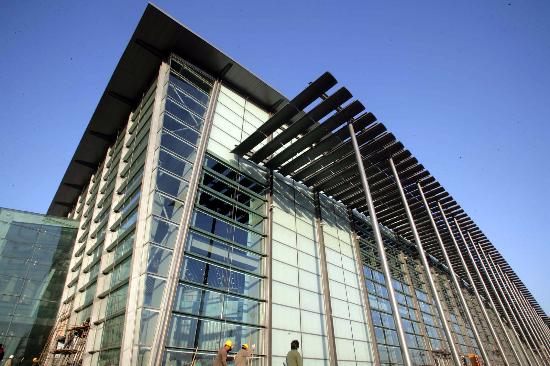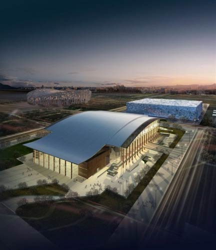 国家体育馆建筑面积8.1万m2,是亚洲最大的室内综合体育馆,波浪形的外观设计灵感来源于中国传统折扇,大跨度双向张弦钢桁架结构为世界之最,是国人设计、施工、运营的民族品牌。