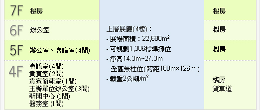 南港展览馆的上层展场屋顶跨距达126x180公尺,净高14.3~27.3公尺,全区无柱位,适合在展览空档期间举办大型演唱会、大型集会、各种球类及技击类体育竞赛。为打造国际级、一流的会展空间,贸协将针对南港展览馆的特性,评估增设多项营运设备,包括多国语言的展场指标及线上导览系统、全馆无线上网等。