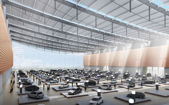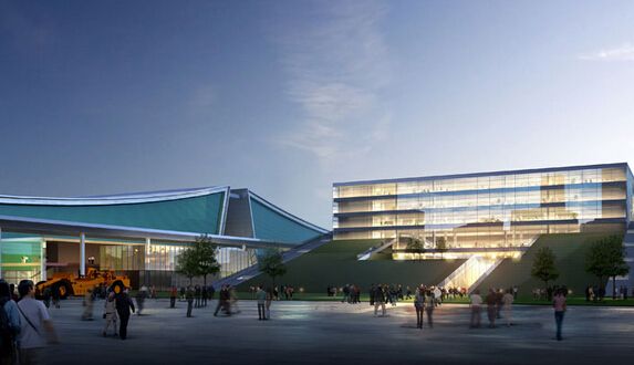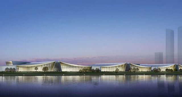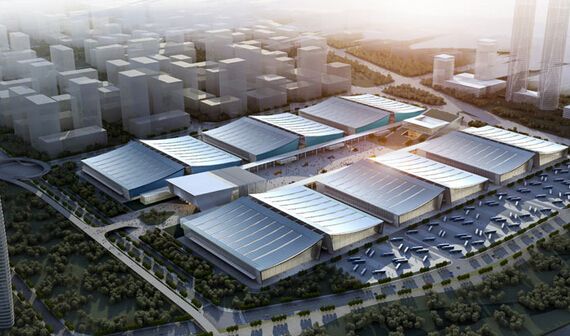 会展中心建筑设计平面共12个展馆、2个登陆厅,总建筑面积约43.3万平方米,其中地上面积约30.1万平方米,室内净展示面积约17.75万平方米,室外净展示面积约8.5万平方米,单个展厅面积约1.45万平方米;场馆设置有小轿车停车位3100个,大货车(大巴)停车位550个,非机动车停车位3200个;场馆周边还规划了会议中心、宾馆酒店、商务楼盘、地铁及其他站场等各类服务功能设施。
